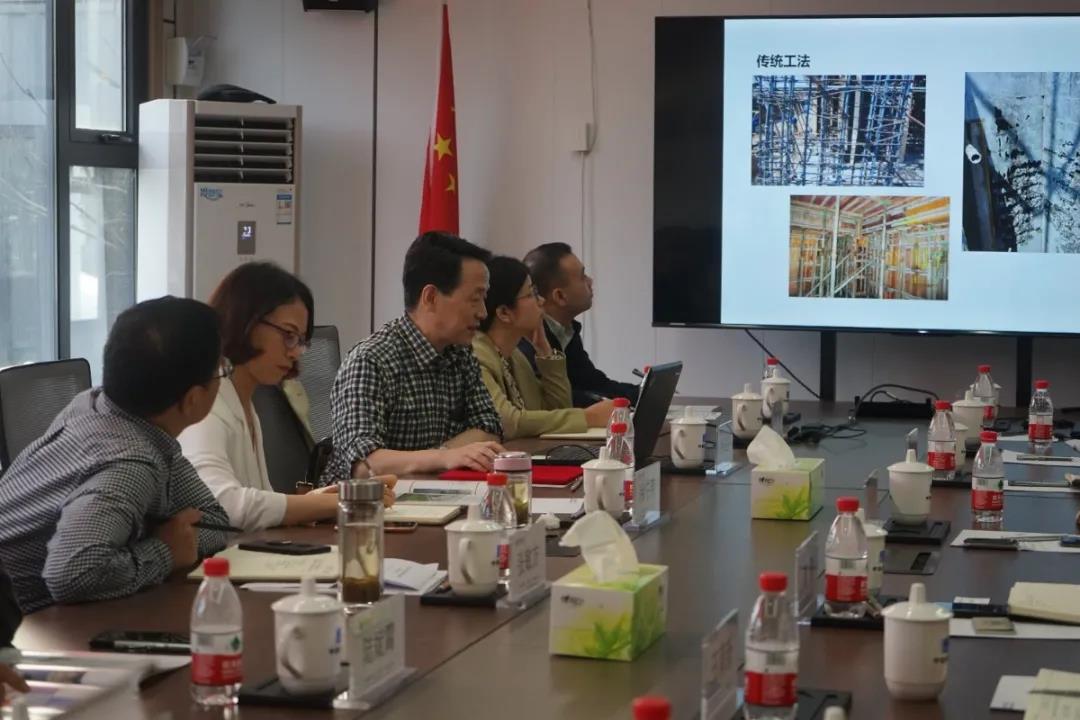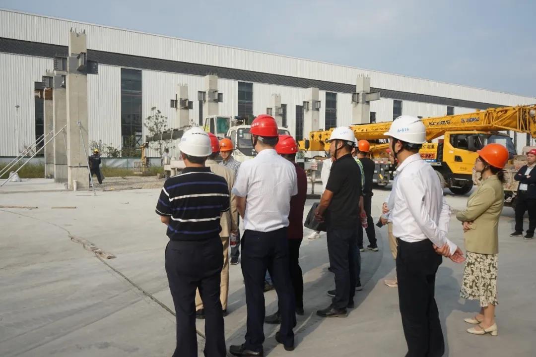 會前,大家參觀了基地內(nèi)各條生產(chǎn)線、構件展示區(qū)和吊裝現(xiàn)場,了解了構件生產(chǎn)工藝、工藝布置、設備運行情況和裝配式建筑吊裝的要點與難點。為加深大家對裝配式混凝土的了解,趙教授還與技術人員就PC生產(chǎn)的工藝流程及關鍵工序等進行了探討交流,并對基地下一步發(fā)展運營提出了寶貴的意見與建議。